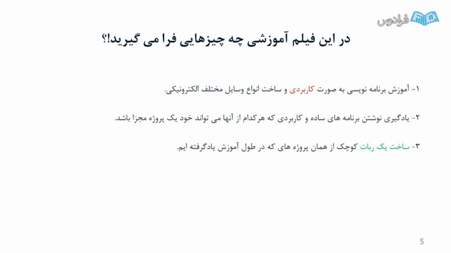 ما در این مجموعه آموزشی، برنامه نویسی را به صورت بسیار ساده و قابل فهم برای اقشار مختلف دانش پژوهان به صورت کاملا عملی و همراه با پروژه های جذاب ارائه می دهیم که شما می توانید آرزوی یادگیری برنامه نویسی و ساخت یک ربات را با حداقل هزینه، به صورت بنیادین تحقق بخشید.